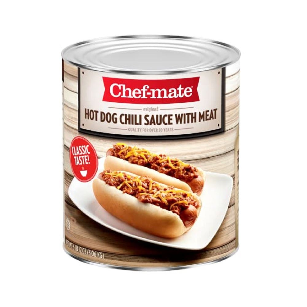 Salsa, perrito caliente, chile, con carne, lista para servir, en lata, #10 Sz Lata