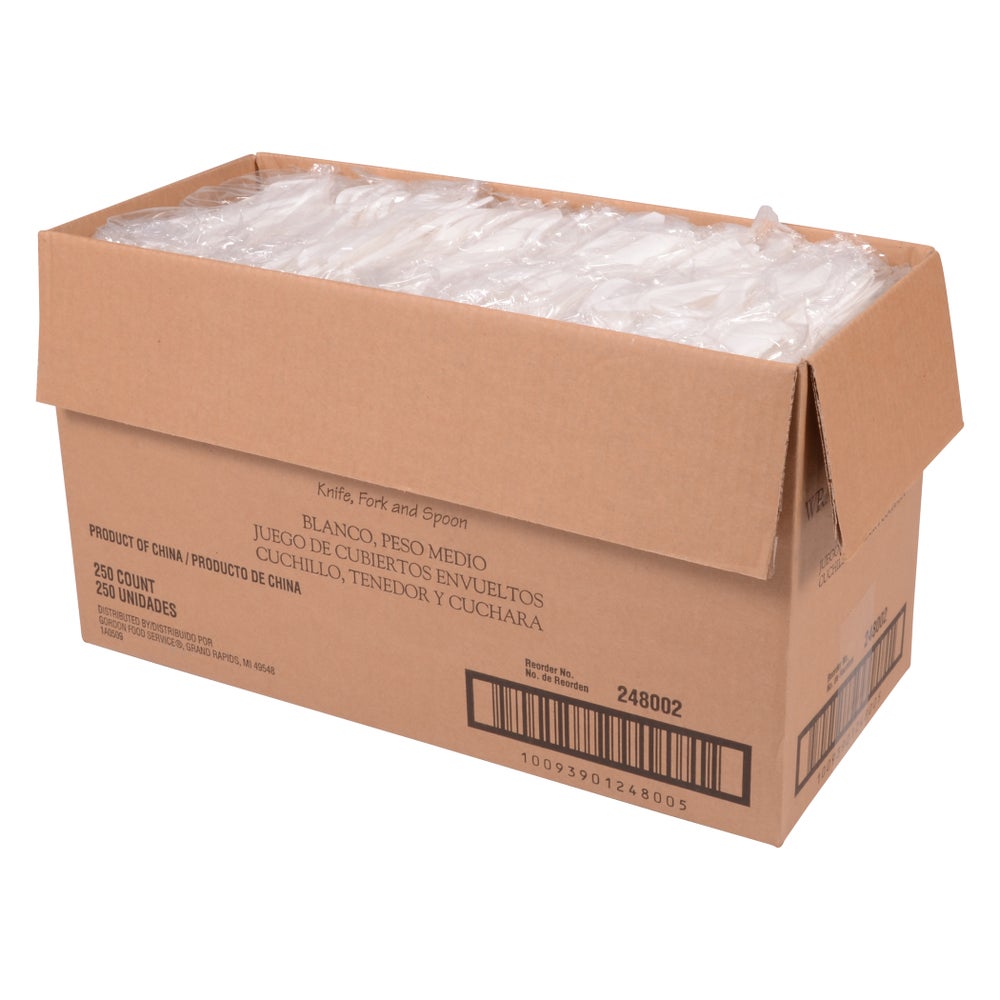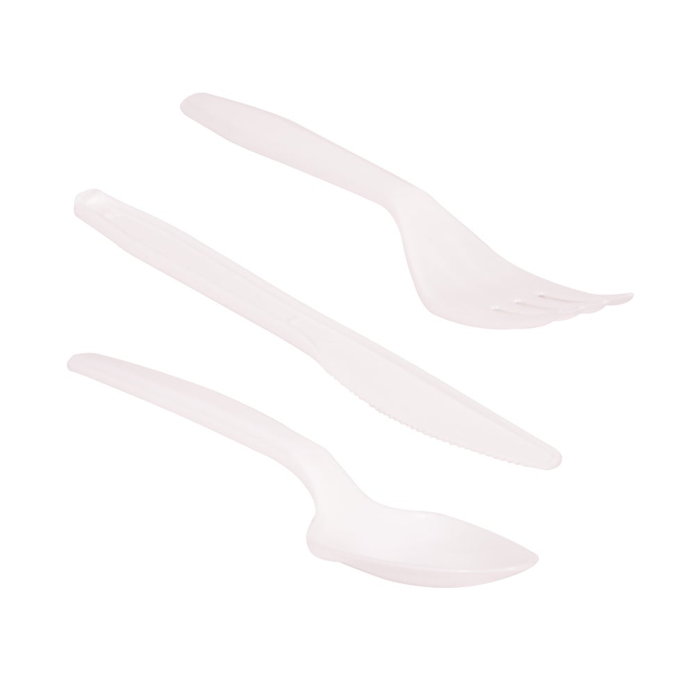 Cubiertos de plástico medianos para tenedor/cuchillo/cuchara, blanco, polipropileno, 3 Pza Paq, 250/Caj