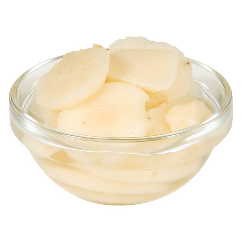 Estas castañas de agua en rodajas están empacadas en agua, ofreciendo una conveniencia lista para usar, ideal para usar como ingrediente en platos de estilo asiático.