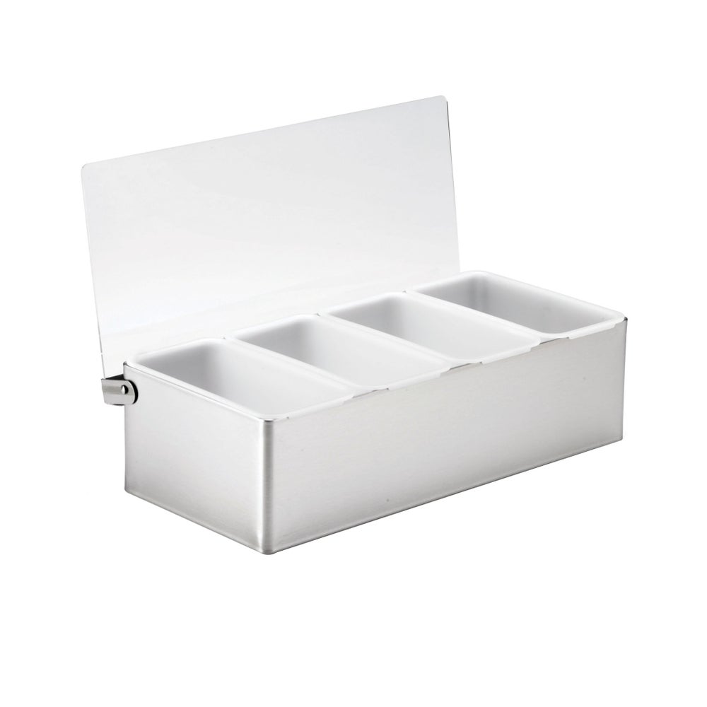 Dosificador de condimentos para barra de 4 compartimentos, acero inoxidable, con pinzas, 1/Cda