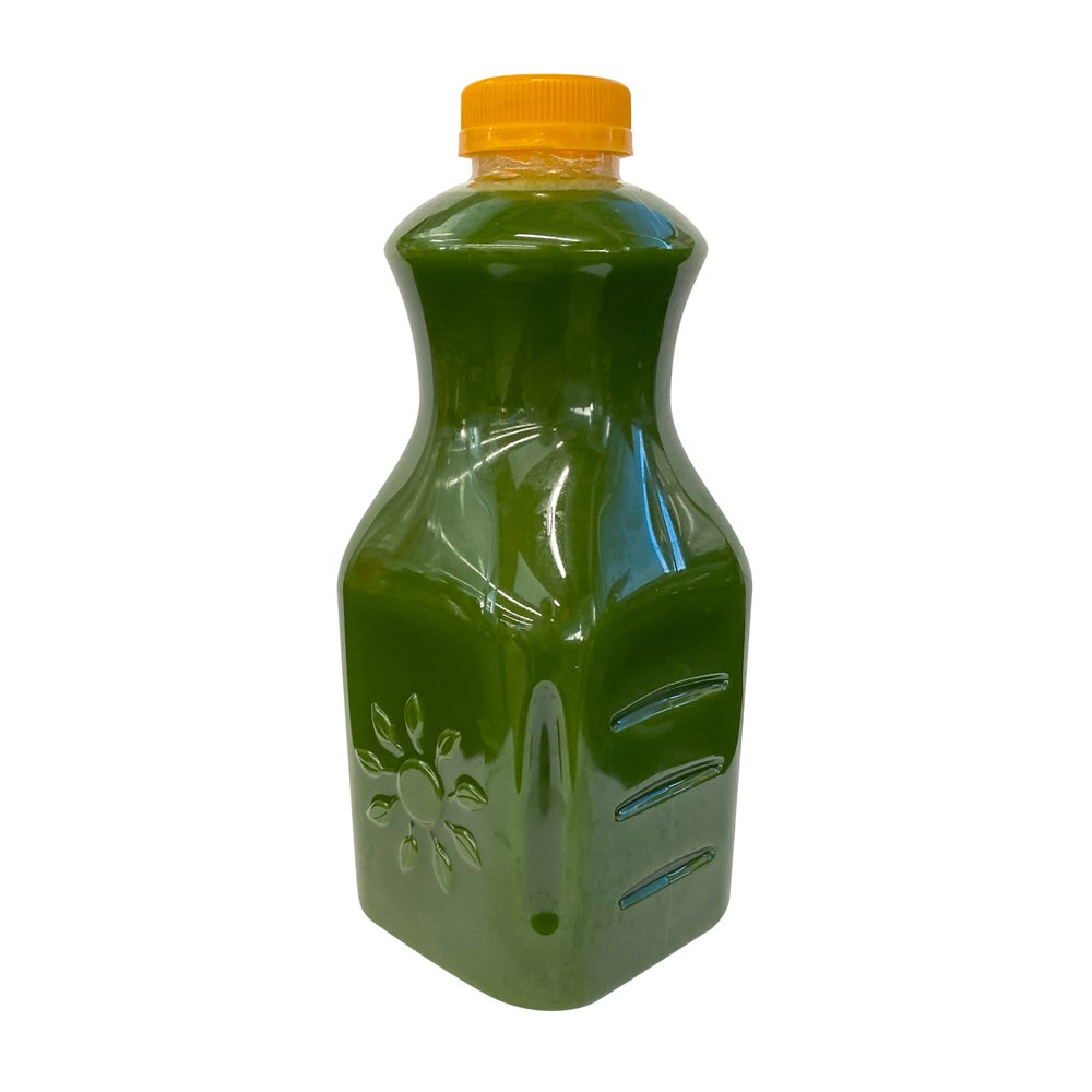 - Hecho de jugos de apio, pepinos, raíz de jengibre, manzana granny smith, col rizada, limón, perejil y espinacas.