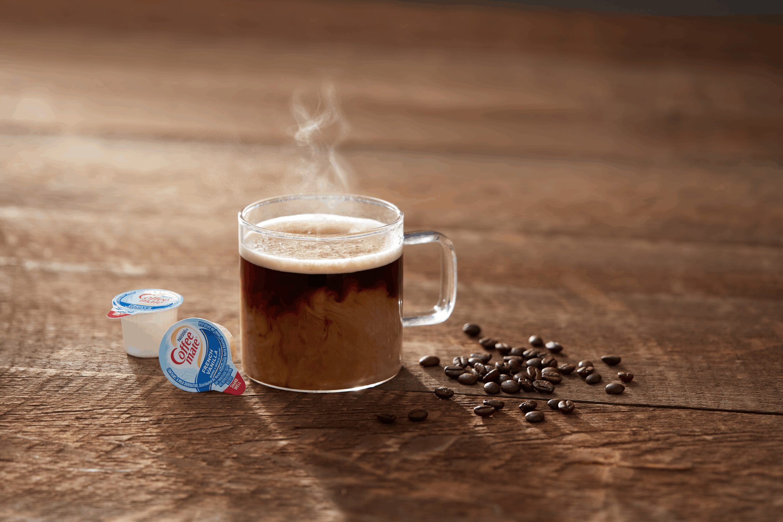 Estos cremeros líquidos sin lácteos vienen en tazas de control de porciones fáciles de servir que no requieren refrigeración. Vienen en una caja de marca para exhibición en el mostrador.
