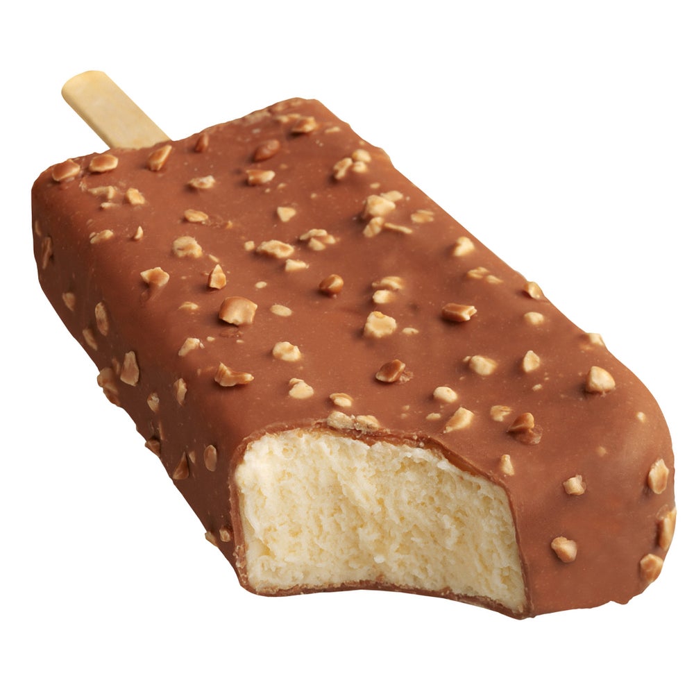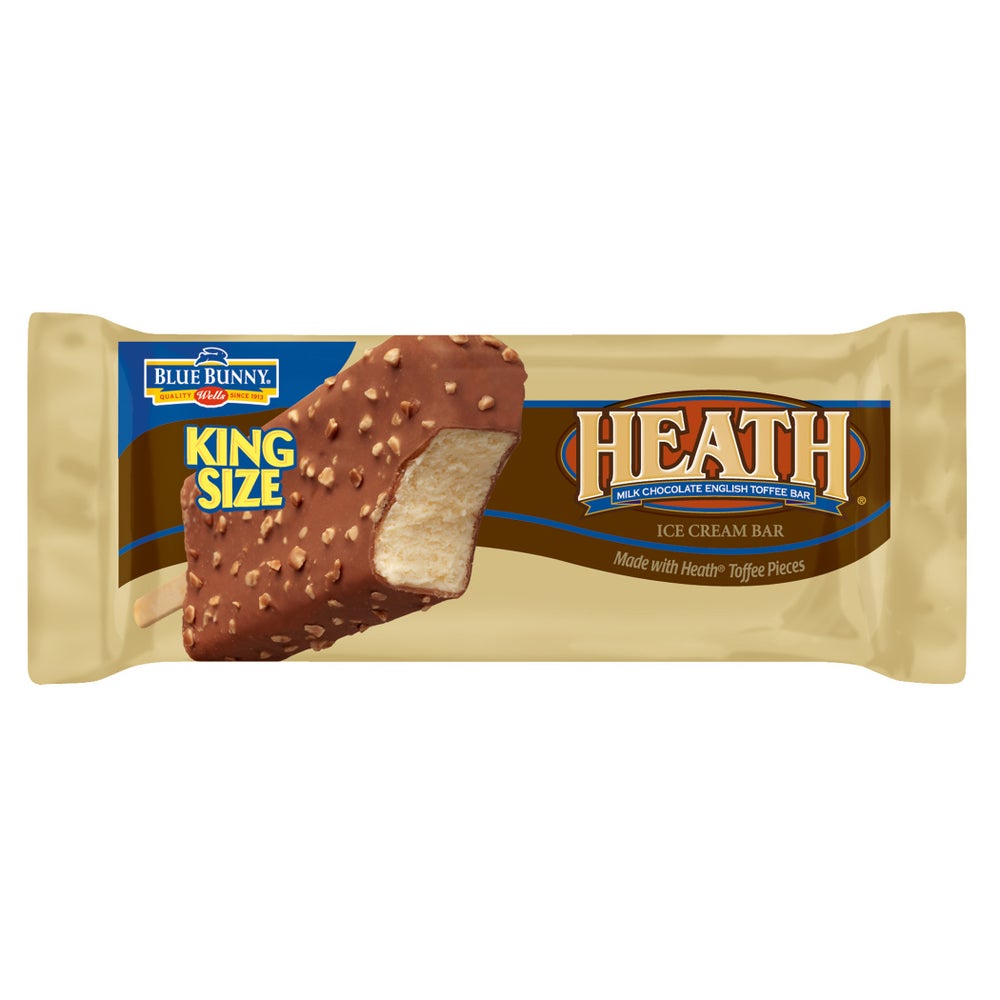 El helado de caramelo rico y cremoso se congela en un palito y luego se cubre con una gruesa capa de chocolate antes de cubrirse con trozos de caramelo Heath.
