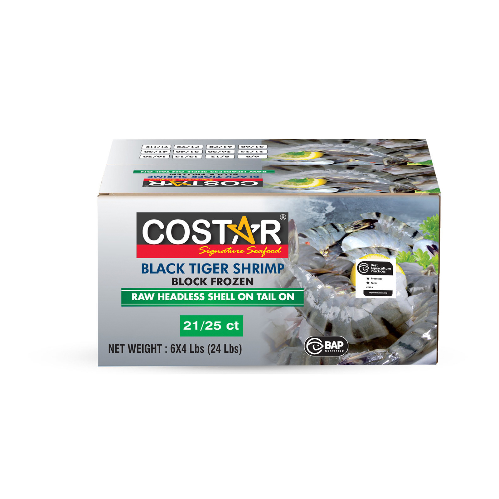 Camarón tigre, con concha, sin cabeza, 21-25 unidades por libra, crudo, congelado, caja de 4 lb, Cjs, 6/Caj