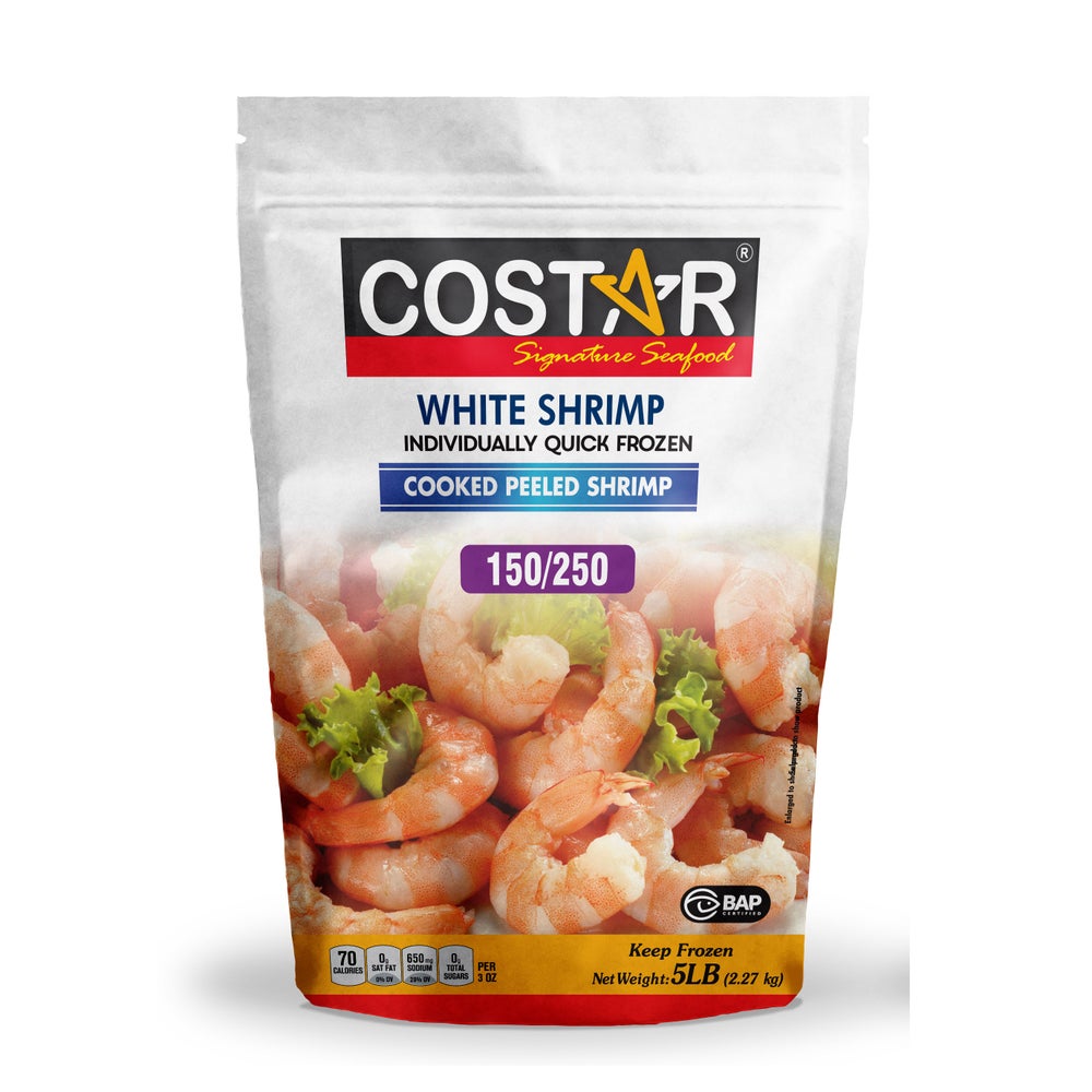 Camarones pelados y desvenados sin cola, 150-250 unidades por libra, cocidos, congelados
