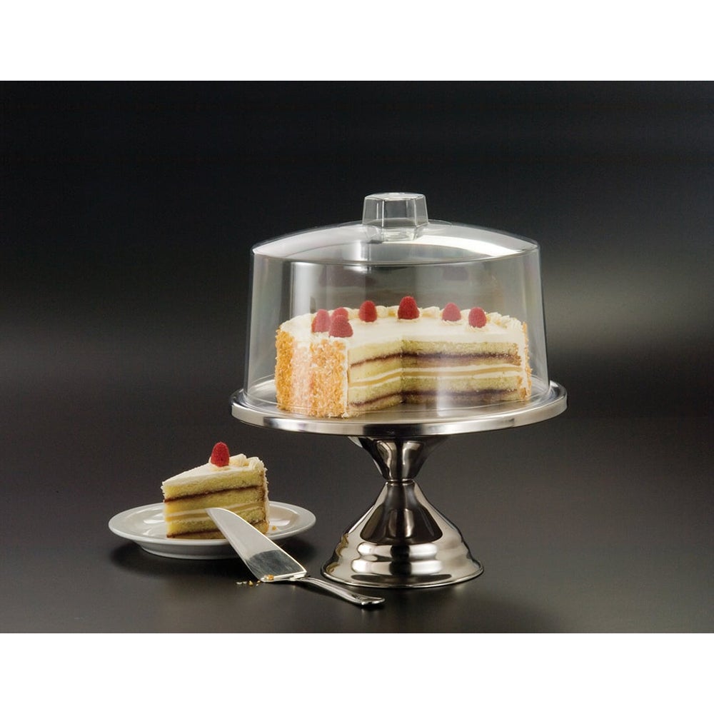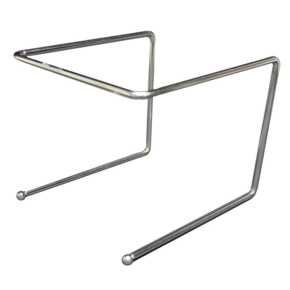 Este soporte para pizza cromado está fabricado con una estructura de acero duradera y proporciona espacio en la mesa a la vez que eleva la presentación de la pizza.