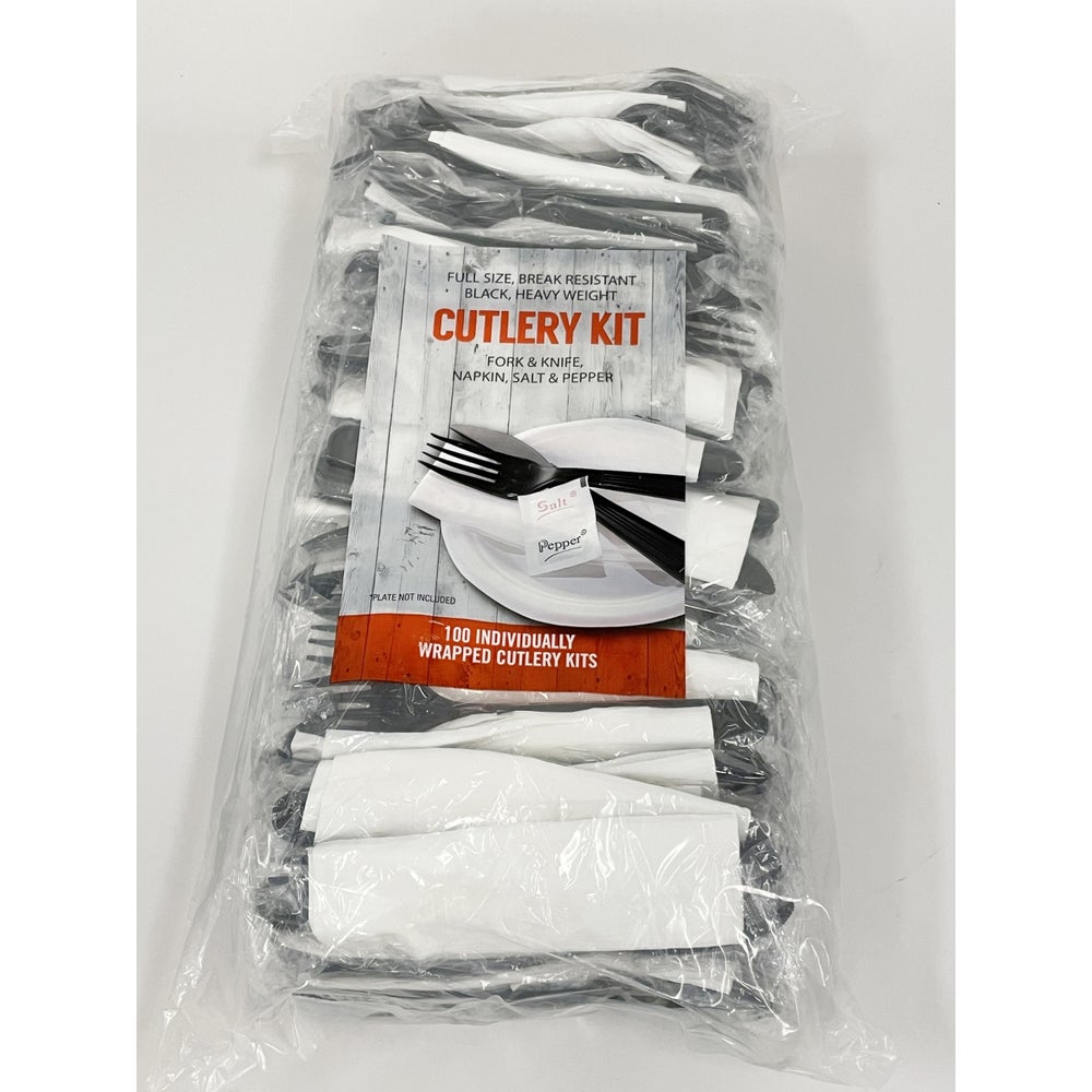Kits de cubiertos de tenedor y cuchillo de plástico de peso pesado, blanco y negro, con servilleta, paquete de 100 unidades