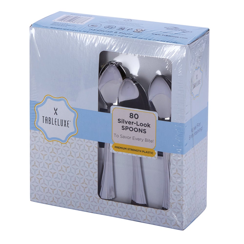 Cucharas de plástico de alta resistencia, plateadas, con mangos largos, poliestireno, 80 Cdd Cjs, 10/Caj