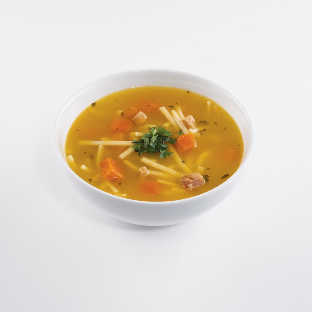 Sopa de fideos con pollo baja en sodio, lista para servir, enlatada
