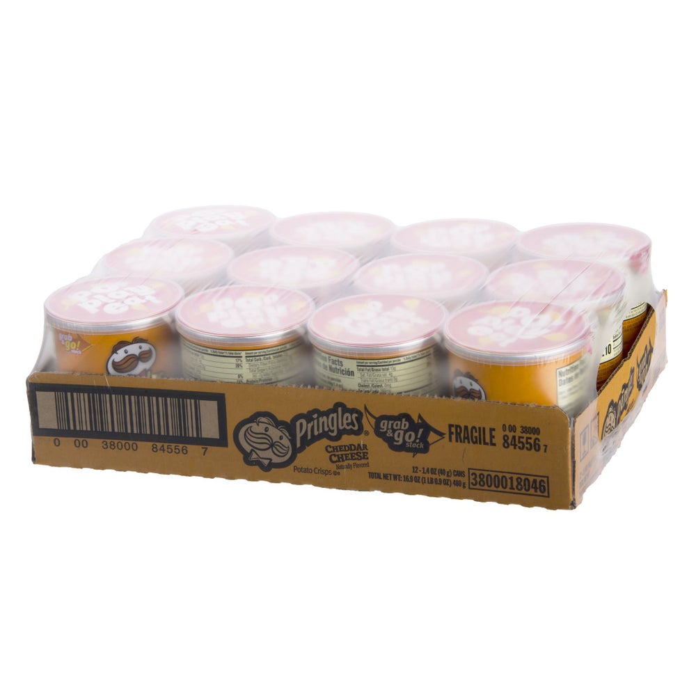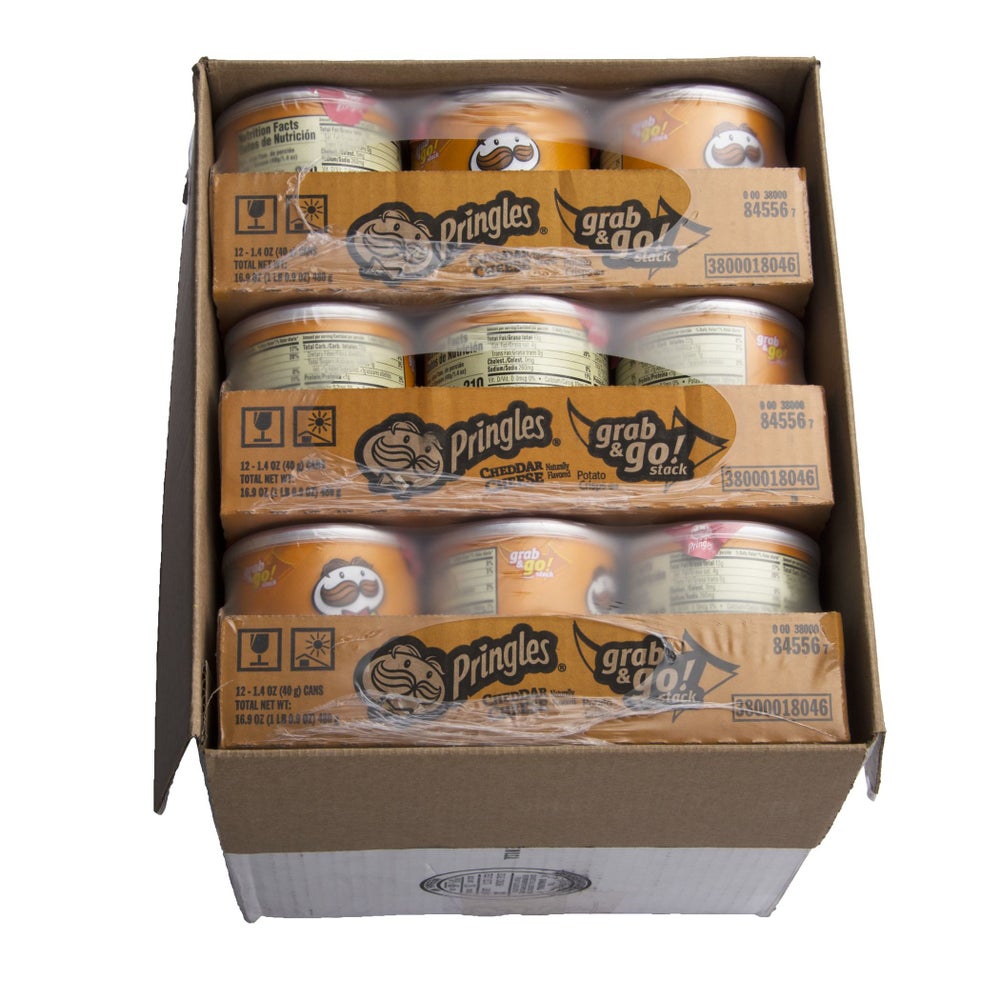 - Each case contains 36 resealable grab and go 1.4 oz cans. Pop open a can and experience the delicious taste and satisfying crunch of Pringles Cheddar Cheese Potato Crisps, always tasty, never greasy.