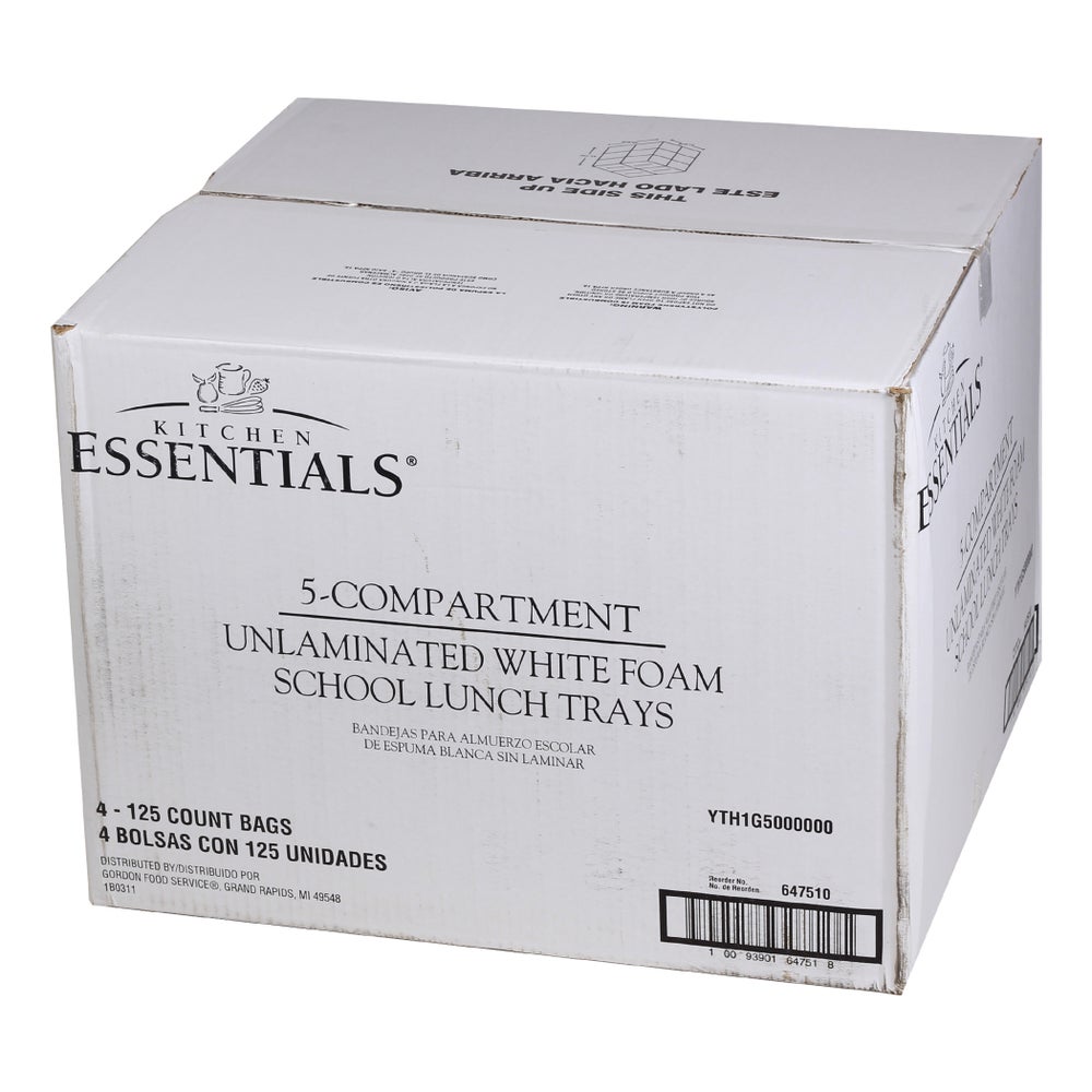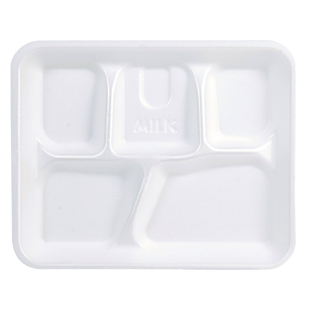 Bandejas de almuerzo escolar de espuma de 8.25 x 10.25 pulgadas con 5 compartimentos, blanco, poliestireno, 125 Cdd Paq, 4/Caj