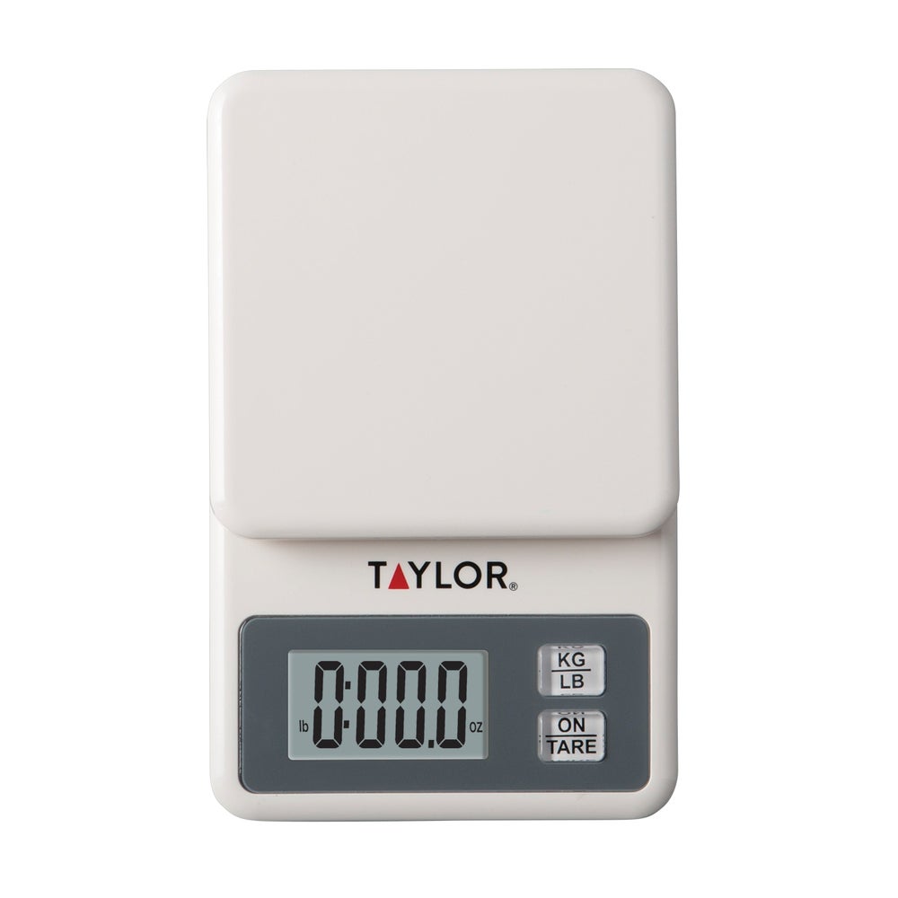 Esta báscula digital compacta para control de porciones tiene una plataforma de acero inoxidable sobre una base negra con números de media pulgada. Se puede usar para medir ingredientes secos y líquidos.