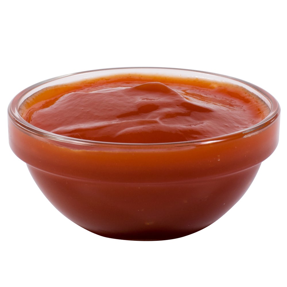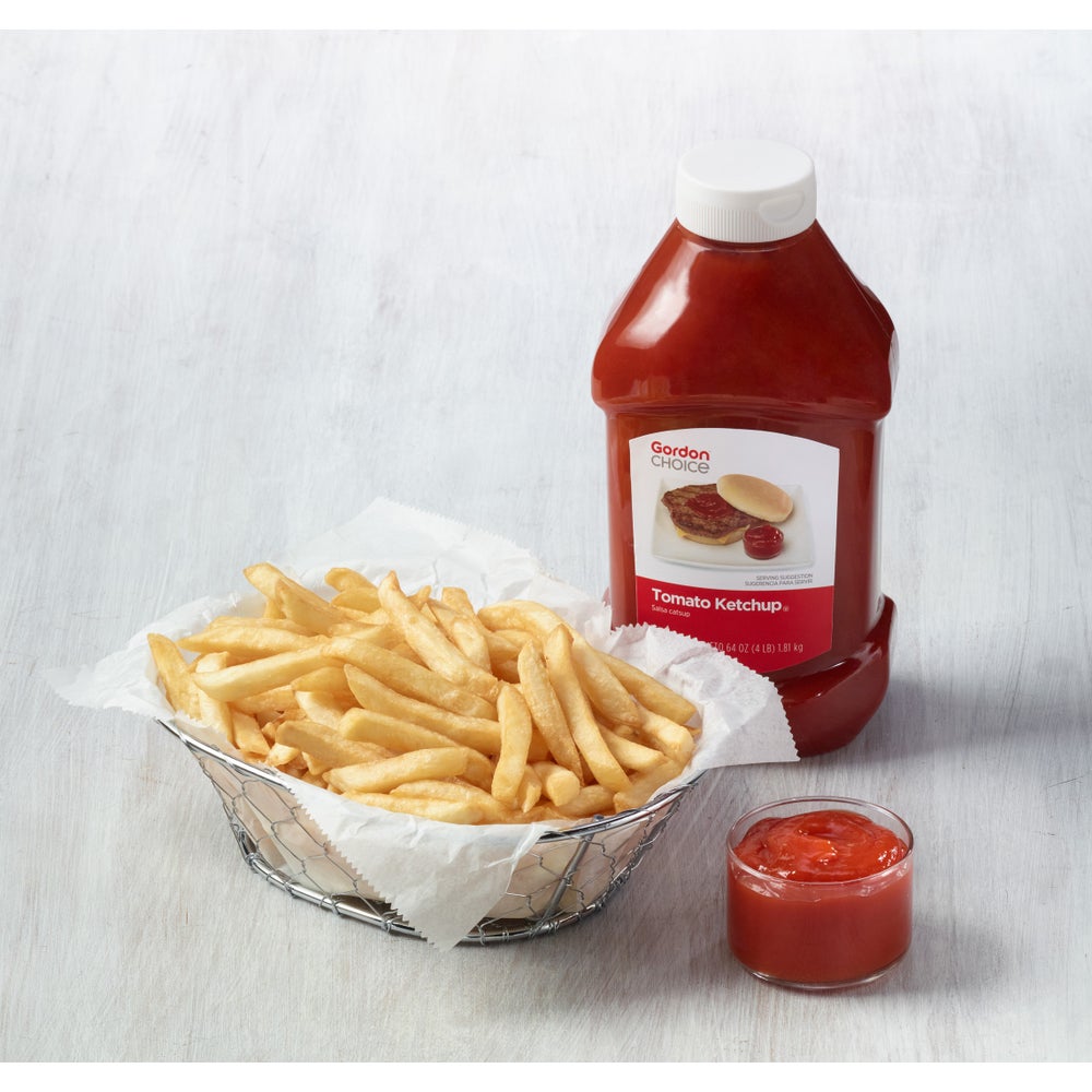 • El ketchup viene en botellas de plástico exprimibles de 64 onzas empacadas en corrugado.