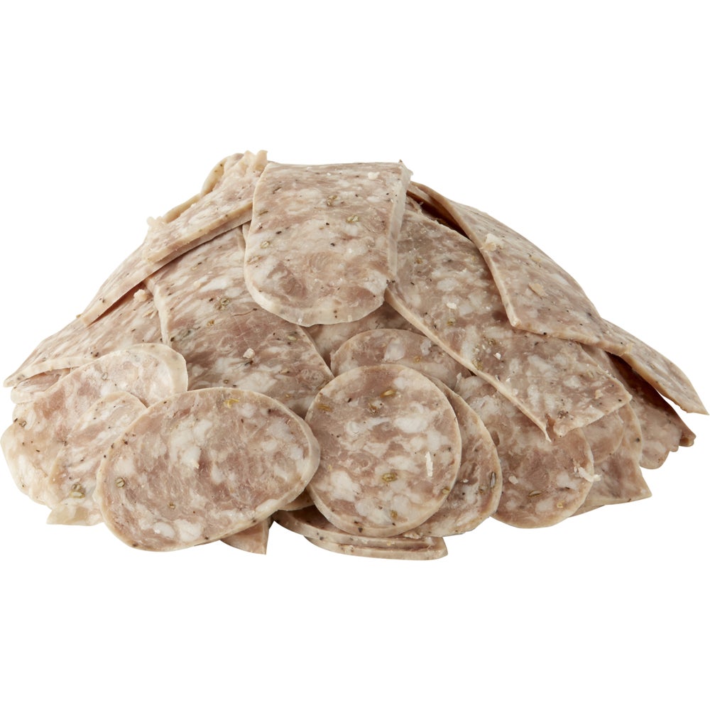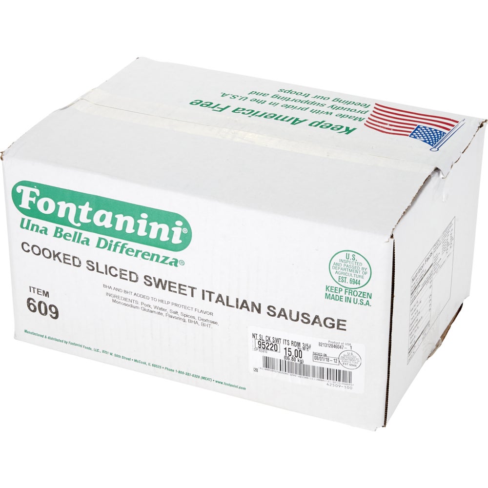 Salchicha de cerdo italiana dulce, rodajas, 4 a 7 rodajas por onza, cocida, congelada, 80 Onz Paq, 3/Caj