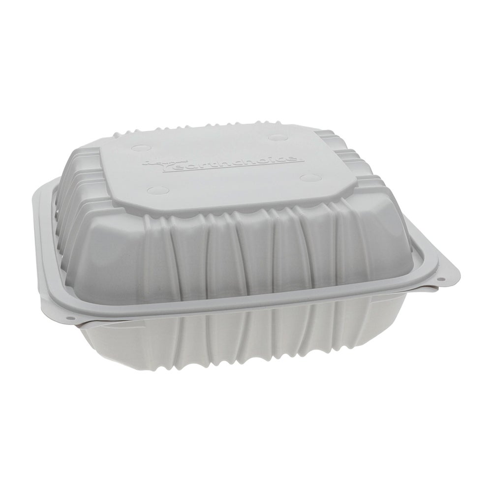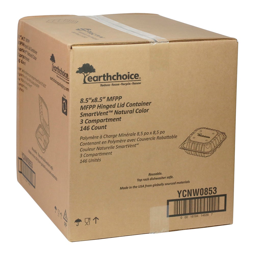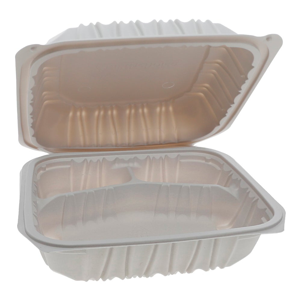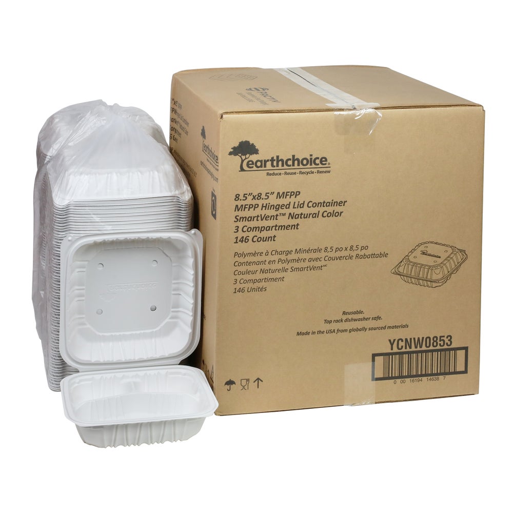 Contenedores de 8,5 x 8,5 pulgadas y 3 compartimentos, blancos, con tapa con bisagras, ventilación opcional, polipropileno cargado con minerales, 73 Cdd Bol, 2/Caj