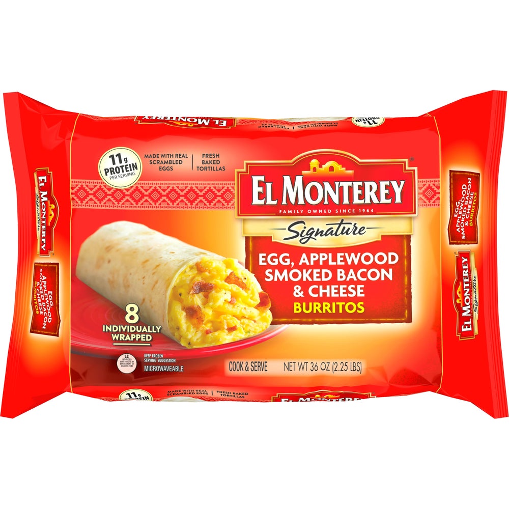 Burritos de desayuno de tocino ahumado con madera de manzano y huevo, queso, cocinar y servir