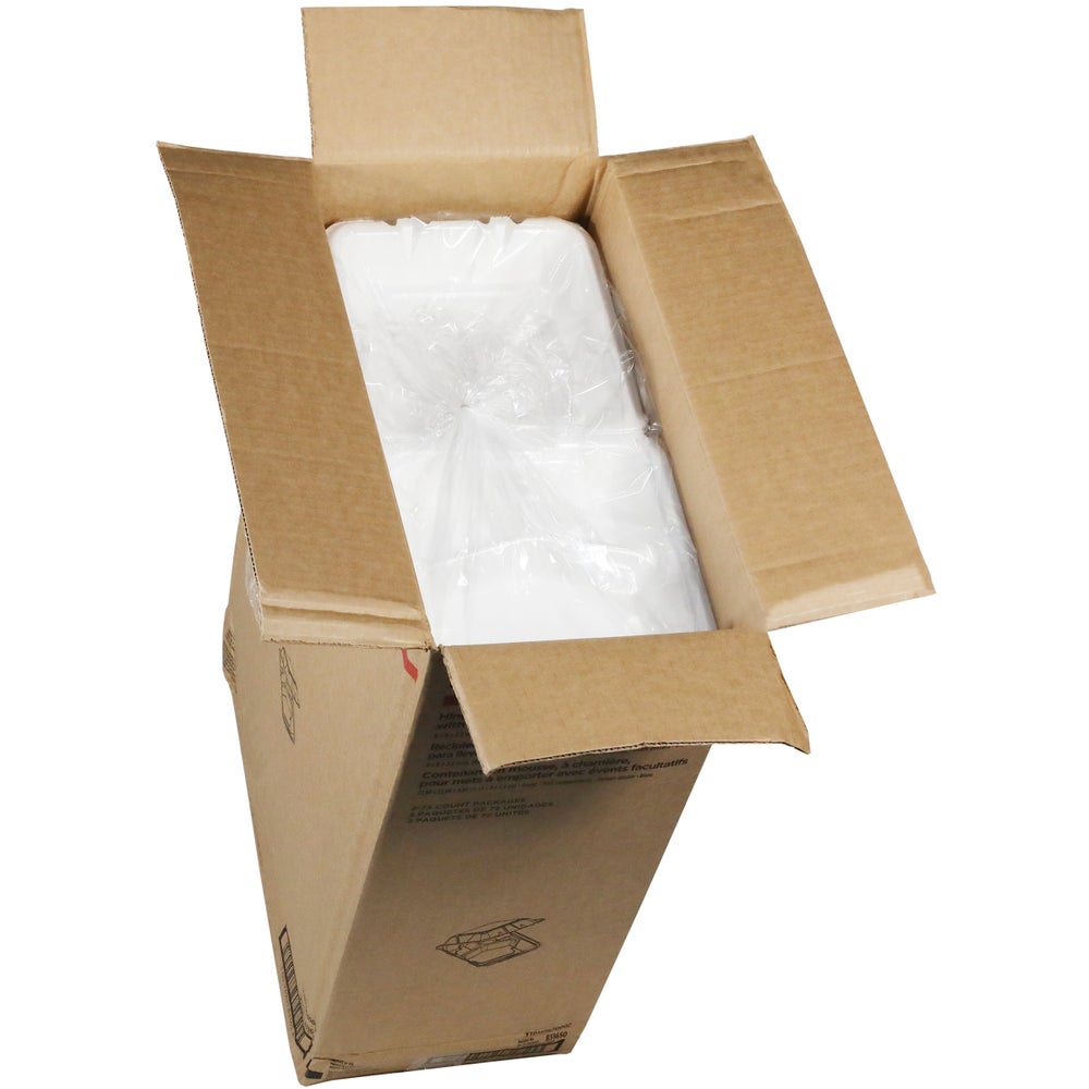 Envases grandes de espuma de 9 x 9 x 3 pulgadas, 3 compartimentos, blancos, con bisagras y con ventilación opcional, poliestireno, 75 Cdd Paq, 2/Caj