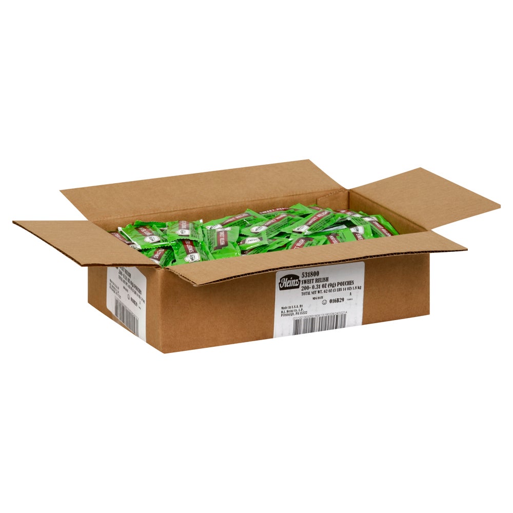 Este relish dulce y picante está hecho de una mezcla de pepinillos y toques de pimientos rojos