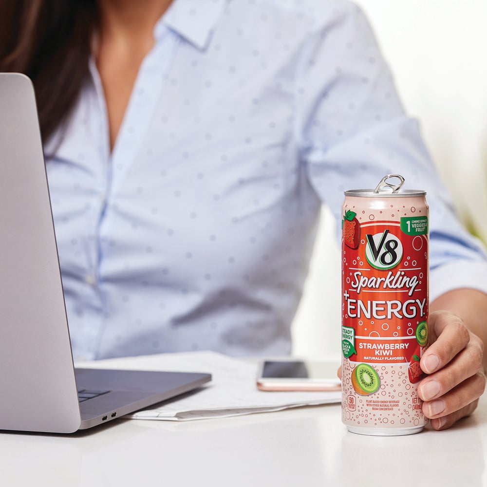 V8 +Energy Bebida Energética Espumosa de Fresa y Kiwi Te Da un Impulso Refrescante de Energía de Origen Vegetal. Ligeramente Carbonatada e Infusionada con Sabores de Fresa y Kiwi