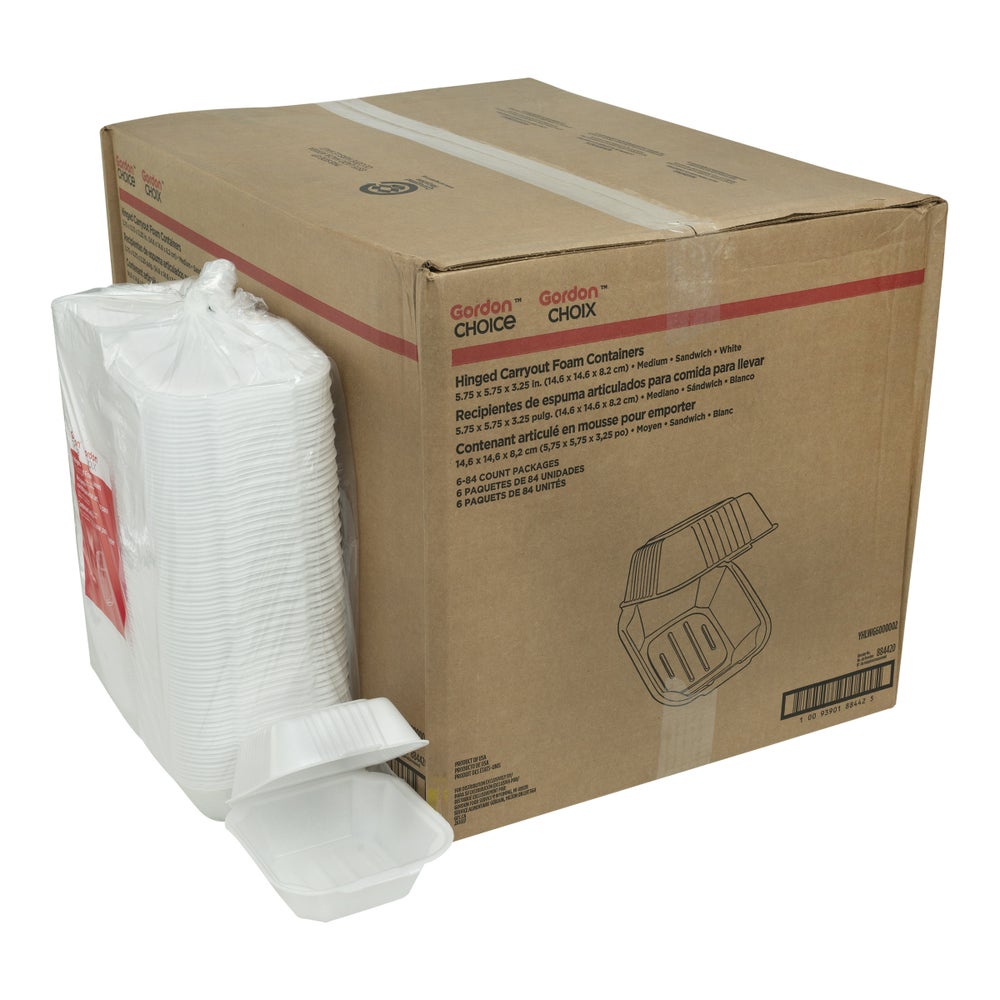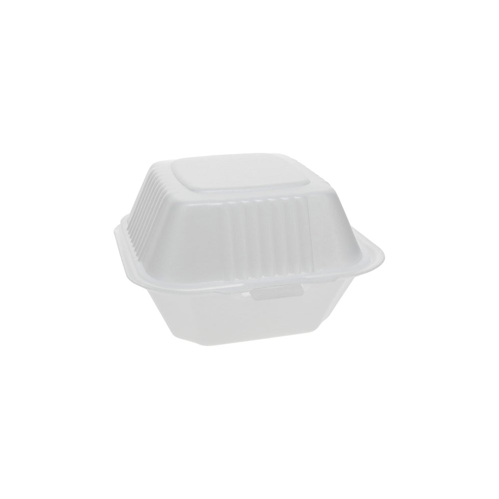 Recipientes de hamburguesa de espuma mediana de 5.75 x 5.75 x 3.25 pulgadas, blancos, con bisagras, poliestireno, 84 Cdd Paq, 6/Caj