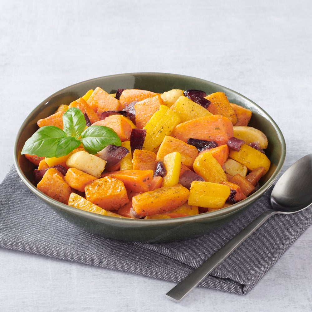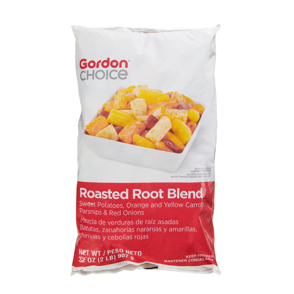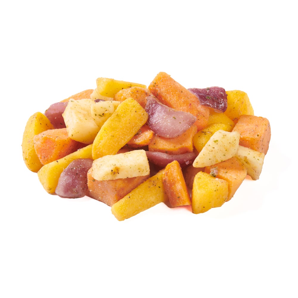 Mezcla de tubérculos horneados, congelados, con camote, zanahoria, chirivía, cebolla roja, 2 Libr Bol, 12/Caj